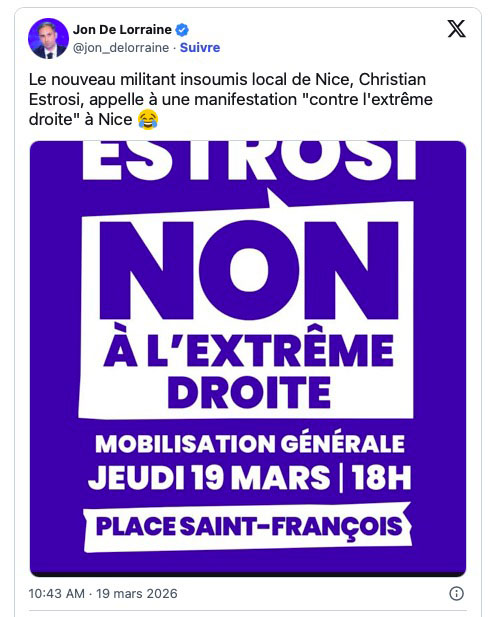 Ce jeudi, les grands mots et les grandes banderoles ont fait leur apparition, sur la place Saint-François de Nice. C’est un combat quasi national auquel se livre Christian Estrosi. La France est attaquée par l’extrême droite via l’axe nord-sud qui mène à la capitale. Un résistant se lève pour lui faire barrage. Slogans rédigés par Mathilde Panot, mots d’ordre empruntés à Louis Boyard. La location des panneaux en carton à LFI fut négociée de main de fer par le trésorier de la réunion. Un lot de « Mort aux fachos » en promo et plein de gros mots à prix cassés. L’affaire tombait à pic.