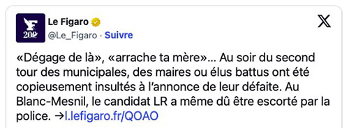«Dégage de là», «arrache ta mère»… Au soir du second tour des municipales, des maires ou élus battus ont été copieusement insultés à l’annonce de leur défaite. Au Blanc-Mesnil, le candidat LR a même dû être escorté par la police. →https://t.co/JQHPxW1fs7 pic.twitter.com/EDHOtAMQFv
