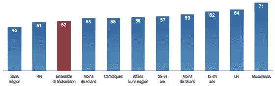 Si l’opposition est partout, elle s’exprime avec plus de force chez les jeunes de moins de 35 ans, et souvent davantage chez les 18-24 ans ; elle s’exprime aussi chez les catholiques et les musulmans, de même que chez les répondants proches du monde de la gauche radicale, de Lutte ouvrière et du Nouveau Parti anticapitaliste (LO-NPA) ainsi que du parti La France insoumise (LFI) ; cette opposition plus marquée vient encore, à un niveau variable mais toujours très majoritaire, des proches des Républicains (LR) et de Reconquête.