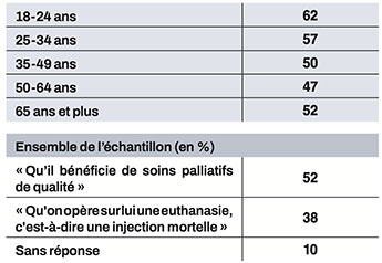 Question : « Imaginez que l’euthanasie soit légale en France et qu’un de vos proches soit gravement malade. Personnellement, préféreriez-vous qu’il bénéficie de soins palliatifs de qualité » (en %)