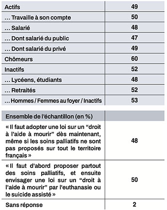 Question : « Aujourd’hui, 22 départements ne disposent pas d’unités de soins palliatifs. Selon vous, il faut d’abord envisager partout des soins palliatifs et ensuite proposer une loi sur l’aide à mourir » (en %)