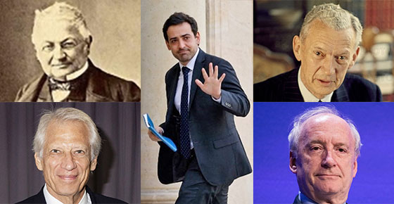 Stéphane Séjourné au milieu de : Adolf Thiers, Maurice Couve de Murville, Dominique de Villepin et Hubert Védrine.