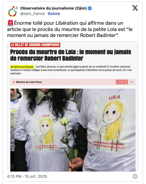 Après avoir rappelé les circonstances sordides du meurtre de Lola, après avoir rappelé l’absence d’empathie ou de remords de la part de la tueuse, après avoir reconnu que le « mobile » (un problème de passe d’accès refusé par la maman de Lola, gardienne d’immeuble) était d’une atroce futilité, la journaliste rappelle les lecteurs de Libération à la « raison ».
