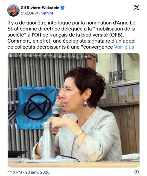 Journaliste à Agriculture & Environnement, Gil Rivière-Wekstein rappelle, sur son compte X, qu’Anne Le Strat est « signataire d’un appel de collectifs décroissants à une convergence antiproductiviste ». Comment cette militante, se demande-t-il, « flirtant avec le groupe radical Extinction Rebellion, et s’opposant farouchement aux « méga-bassines » et à toute « logique techno-solutionniste », peut sereinement et avec impartialité rassembler les différents acteurs (ONG, collectivités, entreprises…) pour « préserver et restaurer la biodiversité » ? »