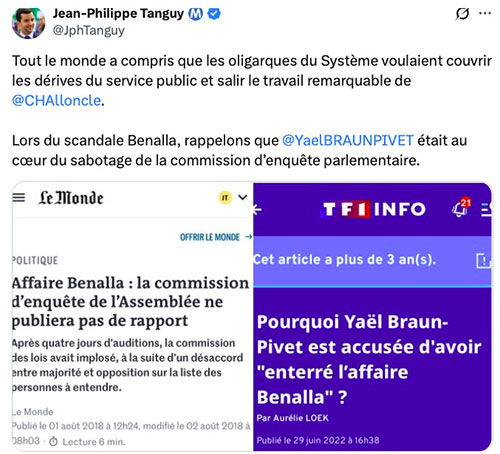 Jean-Philippe Tanguy est venu apporter son soutien à Charles Alloncle en rappelant que la même Yaël Braun-Pivet, alors rapporteur d’une commission d’enquête sur l’affaire Benalla, avait saboté cette commission en refusant d’entendre des témoins importants de l’affaire et avait refusé de publier le rapport final de cette commission !