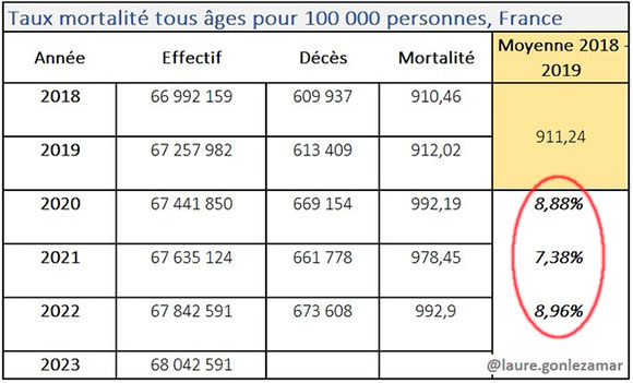 En moyenne sur les années 2020 à 2022, c’est une surmortalité de 8,4 % qui est observée !