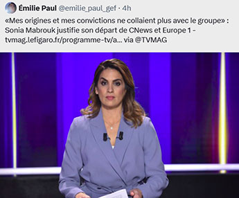 – avec Sonia Mabrouk, figure laïque et critique à CNews, qui invoque soudain « ses origines » pour justifier son départ ;